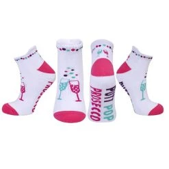 This 3 pack of fun Ladies ankle Golf socks has a golf boozy theme! They are not only fun but also very comfortbale golf socks with a cushioned sole and compression fit, for maximum comfort. Made from a soft, stretchy cotton blend fabric that gives you improved support for your foot. This fabric blend also has great breathability, allowing air to circulate so your feet will feel dry and comfortable whilst not getting sweaty. These Golf Socks won’t lose there shape even after many washes. They are suited to UK sizes between 4 and 7.